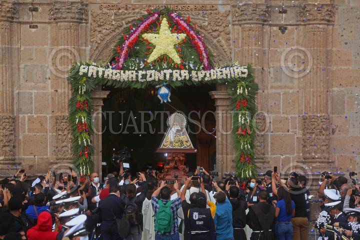 “Patrona contra Epidemias” fue la frase que dio la bienvenida a la Basílica de Zapopan en esta edición atípica de la Romería 2020, por la Pandemia del Coronavirus.