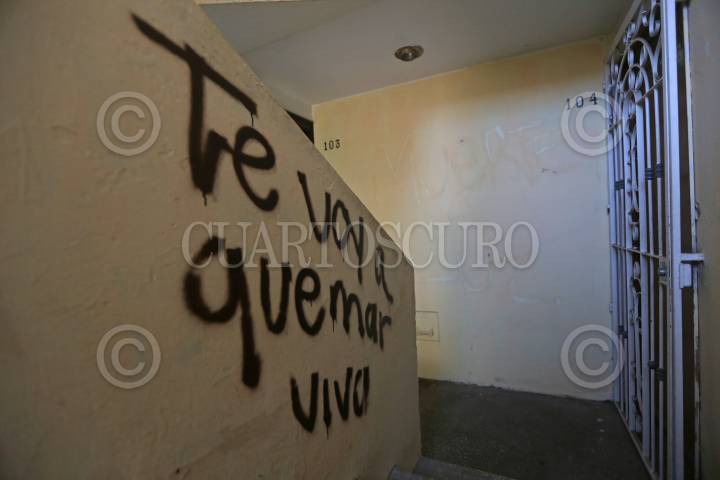 Amenazas escritas con aerosol, en las paredes del complejo de departamentos en donde habitaba Luz Raquel Padilla, antes de ser victima de feminicidio.
