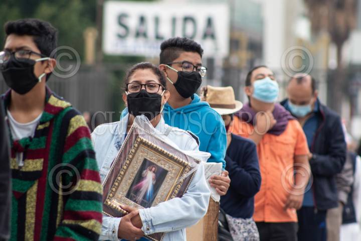 Feligreses realizan filas para recibir la hostia al exterior de la Basílica de Guadalupe.