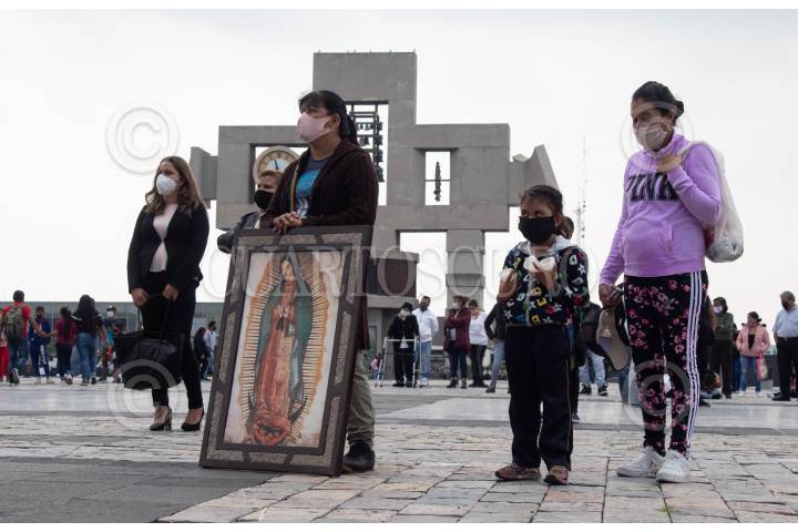 La misa dominical en la Basílica de Guadalupe se celebró al exterior del reciento para evitar contagios por COVID-19. En la imagen una familia observa una figura de la Virgen de Guadalupe.