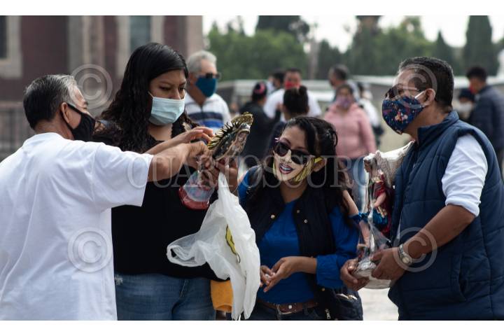 Bajo los rayos del sol y portando cubrebocas, una mujer sostiene la imagen de la Virgen de Guadalupe durante la ceremonia religiosa al exterior de la Basílica .