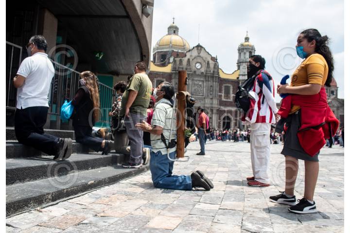 Feligreses al exterior de la Basílica de Guadalupe toman su sana distancia durante la misa dominical.