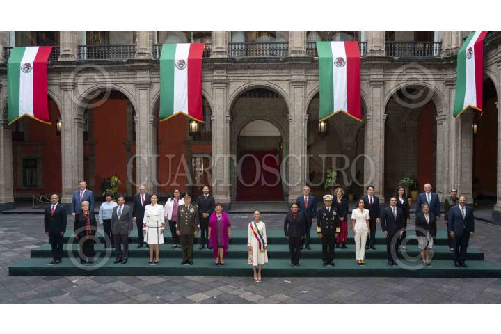 CIUDAD DE MÉXICO, 01OCTUBRE2024- Claudia Sheinbaum, presidenta de México, posa junto a su gabinete federal preciosa a la ceremonia de entrega del bastón de mando realizado en el zócalo capitalino. FOTO: PRESIDENCIA/CUARTOSCURO.COM