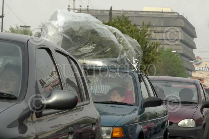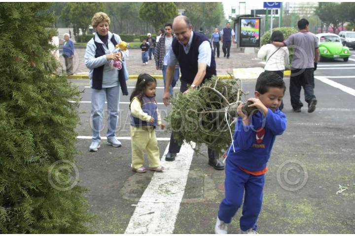 México D.F 11 ENERO 2004.- Una familia lleva su arbol navideño a la explanada de la delegación Benito Juárez, donde se efectua la recaudación de los pinos y así fomentar una nueva cultura ecológica. FOTO: Sandra Perdomo/CUARTOSCURO.COM
