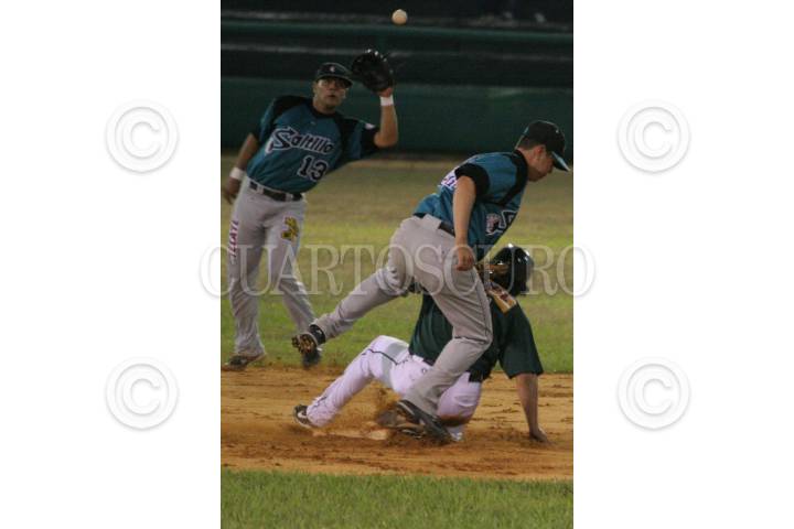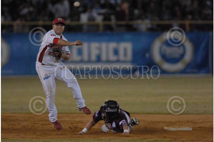 MAZATLÁN, SINALOA, 20ENERO2006.- Los Venados de Mazatlán juegan el séptimo y último juego de la serie en contra de los Tomateros de Culiacán. En la imagen, un jugador de Tomateros es forzado en segunda por Carlos Gastélum. FOTO: DEBATE DE MAZATLÁN