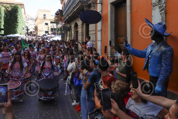 GUANAJUATO, GUANAJUATO, 20OCTUBRE2024.- El colectivo Batalá México ambiento con su música las calles de la ciudad durante las actividades del Festival Internacional Cervantino. FOTO: DANIEL AUGUSTO/ CUARTOSCURO.COM
