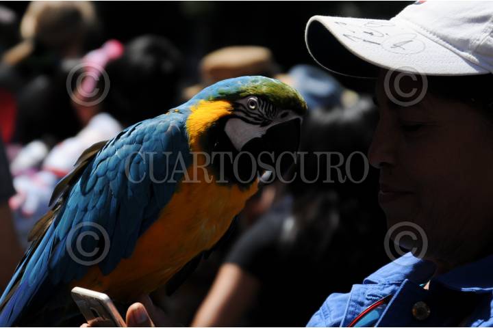 Una persona lleva consigo una guacamaya para participar en el Carnaval de Brasil.