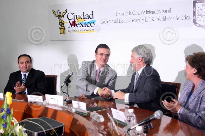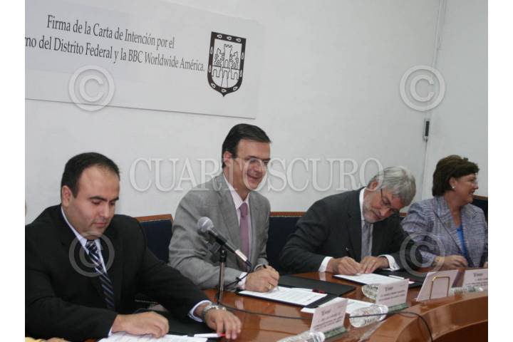 MÉXICO, D.F. 17JULIO2007.- Marcelo Ebrard, jefe de gobierno y representantes de la BBC América durante la firma de la carta de intención para crear nuevo canal de TV digital. FOTO: JAIME WENER/CUARTOSCURO.COM