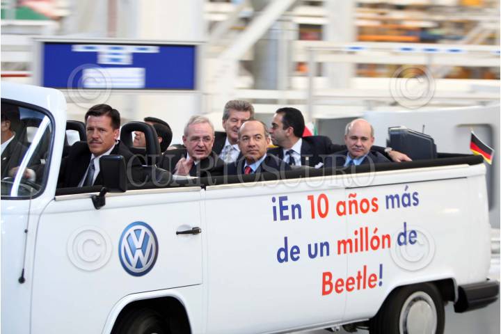 CUATLANCINGO, PUEBLA, 15JULIO2011.- Felipe Calderón Hinojosa, presidente de México, acompañado de Rafael Moreno Valle Rosas, gobernador estatal, y los directivos de la empresa automotriz Volkswagen, visitaron la planta armadora de Puebla, para dar el arranque a la producción del New Beetle. FOTO: FRANCISCO GUASCO/CUARTOSCURO.COM