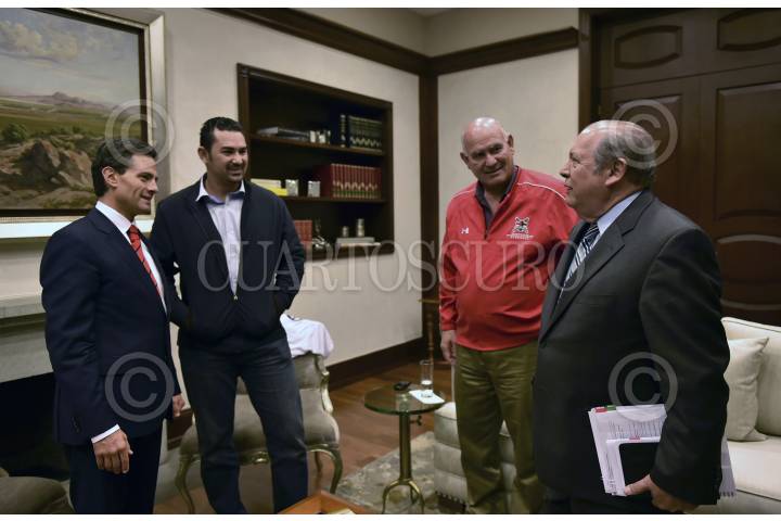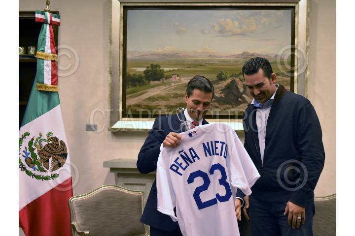 MÉXICO, D.F., 05DICIEMBRE2014.- El Presidente Enrique Peña Nieto, recibió esta noche en la Residencia Oficial de Los Pinos, la visita del beisbolista Adrián González, jugador profesional de Los Dodgers de Los Ángeles, quien el día de ayer fue galardonado con el Premio Nacional del Deporte 2014. FOTO: PRESIDENCIA /CUARTOSCURO.COM
