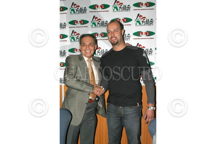 MÉXICO, D.F. 12FEBRERO2007.- El beisbolista Esteban Loaiza saluda al presidente de Federación Mexicana de Beisbol Alonso Perez Gonzalez. FOTO: SAUL LOPEZ/CUARTOSCURO.COM