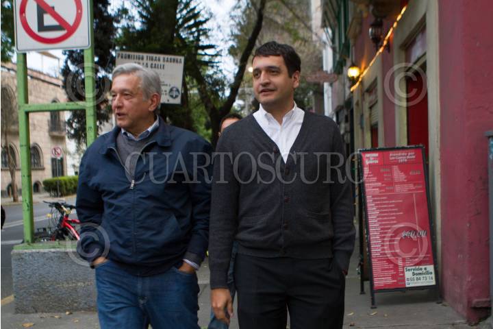 MÉXICO, D.F., 02FEBRERO2015.- Andrés Manuel López Obrador, presidente de Consejo Nacional de Morena, y su hijo Andrés Manuel López Beltrán, acudieron a la presentación de Amílcar Sandoval como precandidato de partido Movimiento de Regeneración Nacional (Morena) a la gubernatura de Guerrero. FOTO: IVÁN STEPHENS /CUARTOSCURO.COM