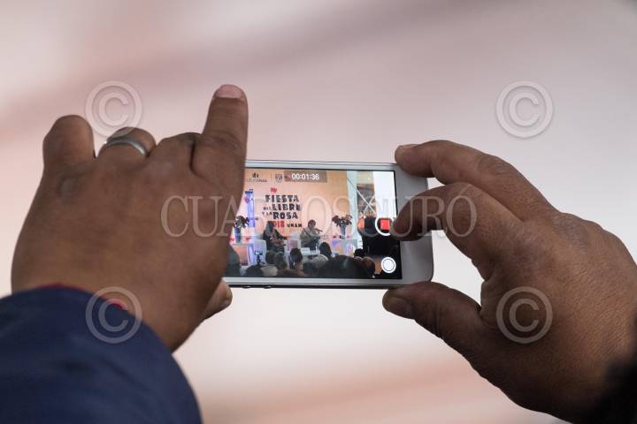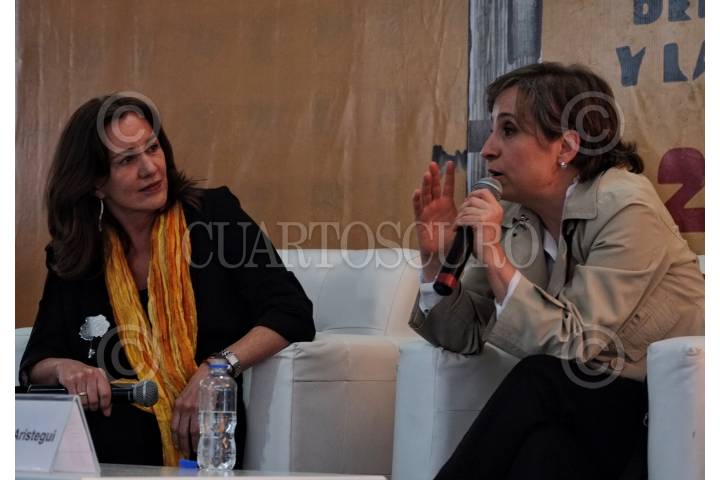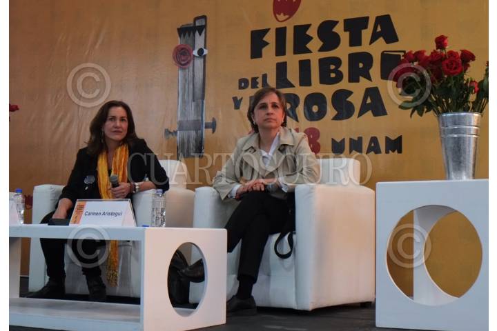 CIUDAD DE MÉXICO, 21ABRIL2018.- María del Carmen Aristegui, periodista mexicana y Rosa Beltrán, directora de literatura, ofrecieron una charla dentro del marco de la Fiesta del Libro y la Rosa con sede en la UNAM. Entre los temas que tocaron, hablaron sobre política y el financiamiento del nuevo aeropuerto. FOTO: ANDREA MURCIA /CUARTOSCURO.COM