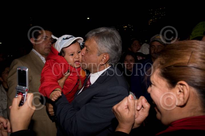 MÉXICO D.F., 03FEBRERO2009.- Andrés Manuel López Obrador, excandidato a la presidencia, a su salida besa a un niño hijo de una simpatizante al termino de su mitin donde exigió al gobierno federal una política económica proponiendo un plan económico, para enfrentarlos efectos de la crisis y también convoco al próximo mitin a celebrarse el 17 de Febrero a las afueras de la Cámara de Diputados, esto a las afueras de las instalaciones de Secretaría Hacienda y Crédito Público. FOTO: GUILLERMO PEREA/CUARTOSCURO.COM