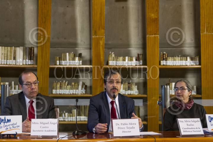 CIUDAD DE MÉXICO, 20FEBRERO2017.- Miguel Ángel Castro, secretario Académico, Pablo Mora Pérez-Tejada, director de la Biblioteca Nacional, y Silvia Salgado Ruelas, coordinadora de la Biblioteca Nacional, anunciaron la celebración del 150 aniversario de la institución, con la realización diversas actividades entre las que destaca el inicio de la construcción del Centro de Preservación Documental en Juriquilla, Querétaro. FOTO: ISAAC ESQUIVEL /CUARTOSCURO.COM