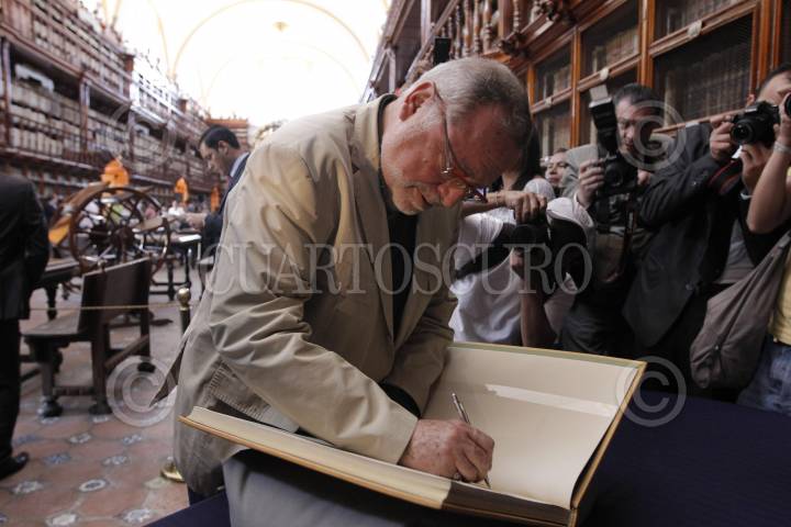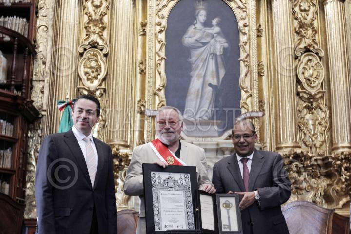 PUEBLA, PUEBLA, 13MARZO2014.- Fernando Savater, escritor, filósofo y activista español, recibió de manos del secretario de cultura del estado de Puebla, Luis Maldonado Venegas, la “clavis" o llaves de la Biblioteca Palafoxiana de Puebla, por su trayectoria literaria y aporte a la cultura. FOTO: HILDA RÍOS /CUARTOSCURO.COM
