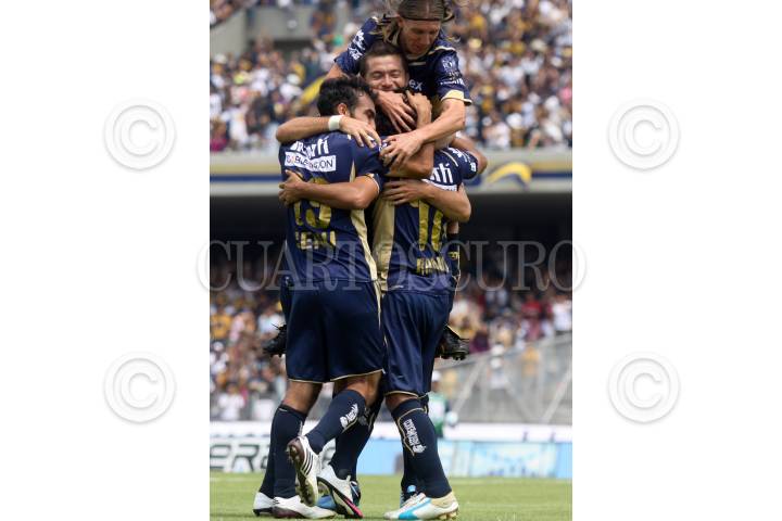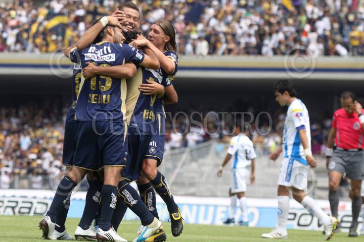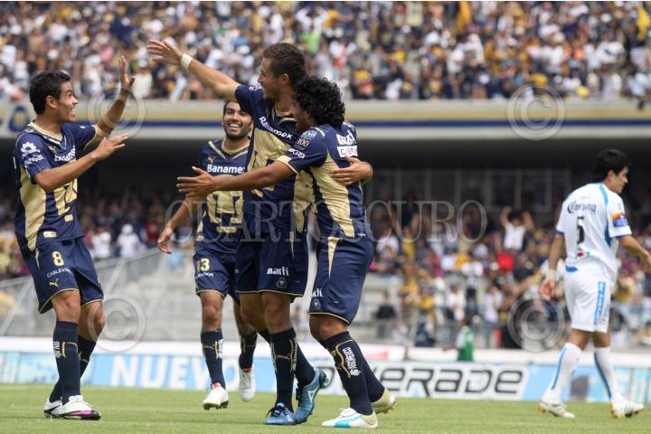 MÉXICO, D.F., 07MARZO2010.- Jugadores de los Pumas celebran su anotación de gol ante el equipo de Puebla donde el equipo de los pumas consiguió su tercera victoria en casa; anotando cuatro goles y sumado 16 puntos en la fecha 9 del Torneo Bicentenario. FOTO: SÁSHENKA GUTIÉRREZ/CUARTOSCURO.COM