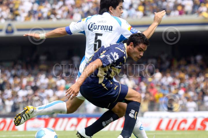 MÉXICO, D.F., 07MARZO2010.- Pablo Barrera celebró disputa el balon con Álvaro Ortíz de Puebla en el estadio Universitario donde el equipo de los pumas consiguió su tercera victoria en casa; anotando cuatro goles y sumado 16 puntos en la fecha 9 del Torneo Bicentenario. FOTO: SÁSHENKA GUTIÉRREZ/CUARTOSCURO.COM