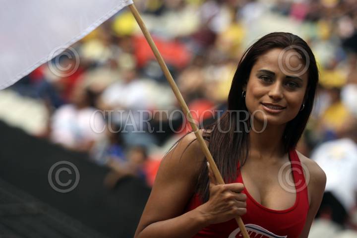 MÉXICO, D.F., 07MARZO2010.- Una edecan camina en la cancha del estadio Azteca, previo al encuentro entre America-Queretaro fecha 9 del Torneo Bicentenario. FOTO: SÁSHENKA GUTIÉRREZ/CUARTOSCURO.COM