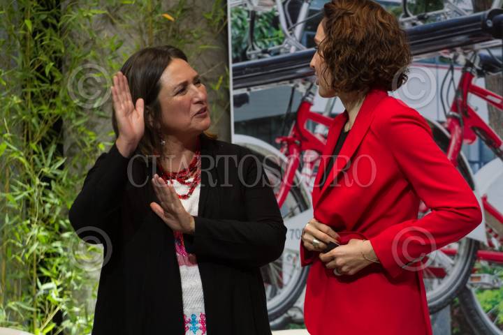 CIUDAD DE MÉXICO, 05JUNIO2017.- Xóchitl Gálvez, delegada en Miguel Hidalgo, y Tanya Müller, secretaria del Medio Ambiente, durante la presentación de los nuevas unidades del programa Ecobici, las cuales son bicicletas eléctricas que ayudarán a que se hagan viajes más largos en menos tiempo, también se dio a conocer las nuevas rutas por las que correrá este sistema de transporte individual. FOTO: MOISÉS PABLO /CUARTOSCURO.COM