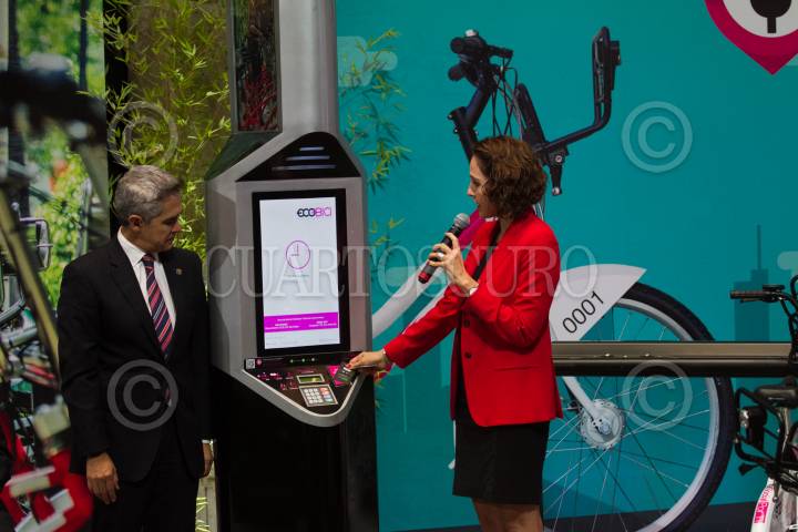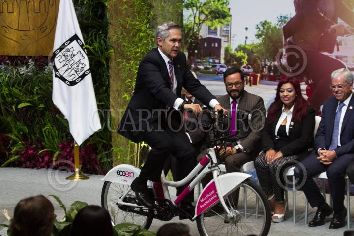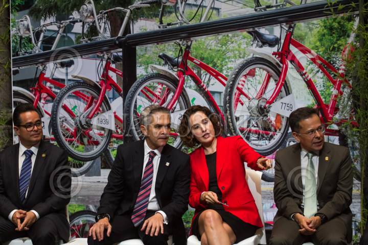CIUDAD DE MÉXICO, 05JUNIO2017.- Miguel Ángel Mancera, Jefe de Gobierno, y Tanya Müller, secretaria del Medio Ambiente, durante la presentación de los nuevas unidades del programa Ecobici, las cuales son bicicletas eléctricas que ayudarán a que se hagan viajes más largos en menos tiempo, también se dio a conocer las nuevas rutas por las que correrá este sistema de transporte individual. FOTO: MOISÉS PABLO /CUARTOSCURO.COM