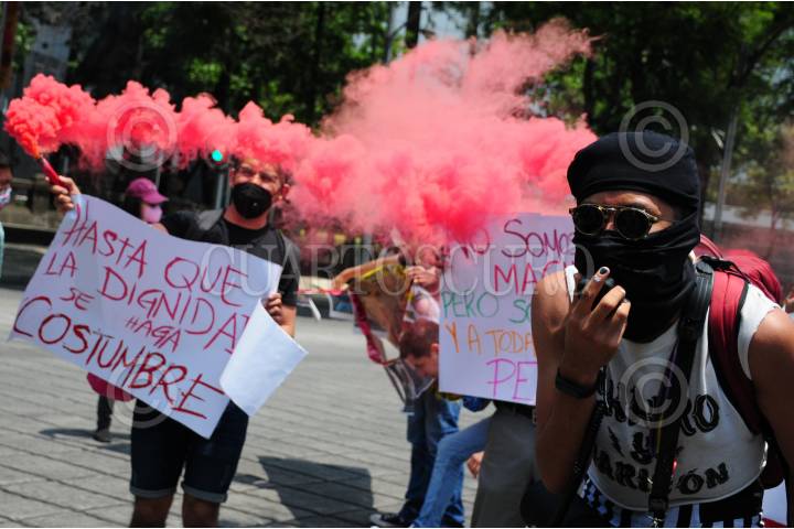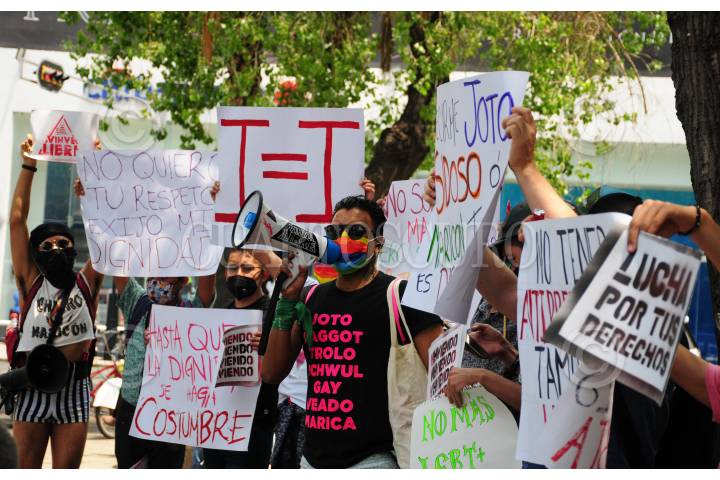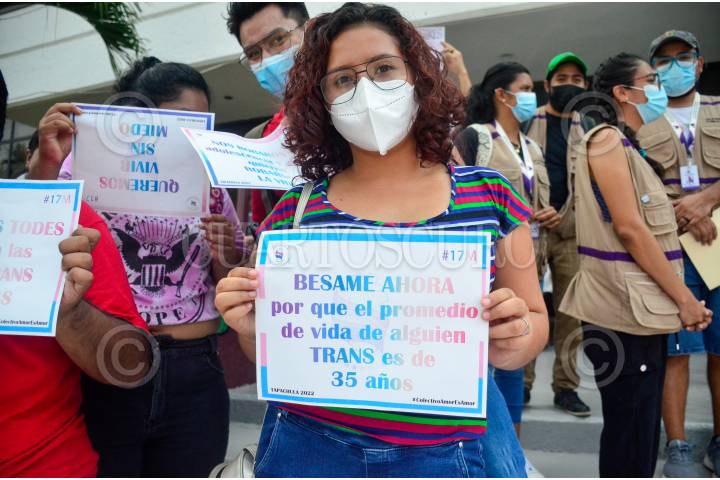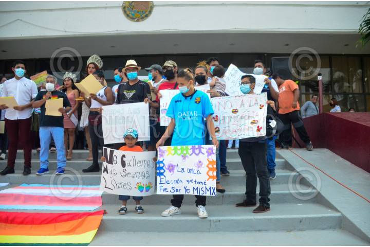 Integrantes de la comunidad LGBTTTIQ+ se manifestaron en el Palacio Municipal de Tapachula, en marco del Día Internacional contra la Homofobia, Transfobia y Bifobia.