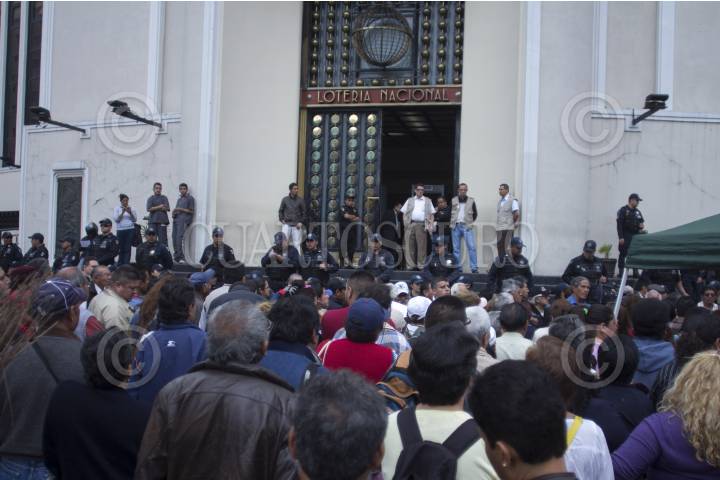 MÉXICO, 07NOVIEMBRE2013.- Vendedores de Billetes de Lotería, se manifestaron frente al Edifico de la Lotería Nacional el cual estuvo resguardado por elementos de la Policía Federal. FOTO: ENRIQUE ORDÓÑEZ /CUARTOSCURO.COM