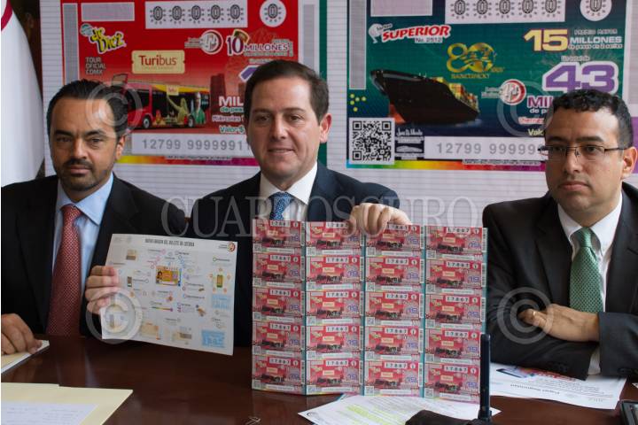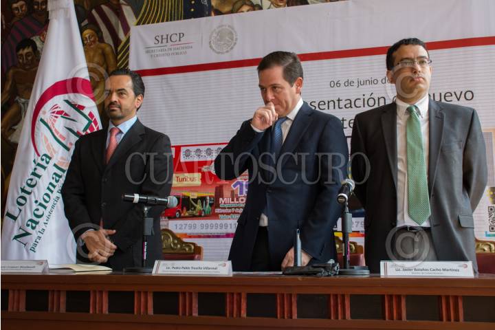 CIUDAD DE MÉXICO, 06JUNIO2017.- Pedro Pablo Treviño Villareal, director general de la Lotería Nacional para la Asistencia Pública; Roberto Compean Woolworth, subdirector general de Comercialización y Servicios, y Javier Bolaños Cacho, director de Comercialización, presentaron las nuevas medidas de seguridad que cuentan los billetes de lotería. Entre las nuevas innovaciones resaltan la inclusión de elementos variables cromáticos e imágenes dinámicas visibles sólo con descodificador, código “QR” para ser descodificado por un teléfono inteligente, y código verificado visible sólo con un lector digital. FOTO: MARIO JASSO /CUARTOSCURO.COM