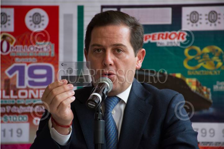 CIUDAD DE MÉXICO, 06JUNIO2017.- Pedro Pablo Treviño Villareal, director general de la Lotería Nacional para la Asistencia Pública, presentó las nuevas medidas de seguridad que cuentan los billetes de lotería. Entre las nuevas innovaciones resaltan la inclusión de elementos variables cromáticos e imágenes dinámicas visibles sólo con descodificador, código “QR” para ser descodificado por un teléfono inteligente, y código verificado visible sólo con un lector digital. FOTO: MARIO JASSO /CUARTOSCURO.COM