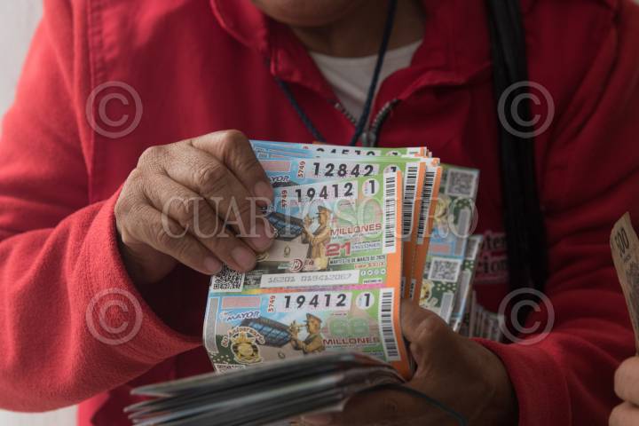 Una mujer vende billetes de lotería conmemorativos por el aniversario del Centro de Estudios Superiores Navales