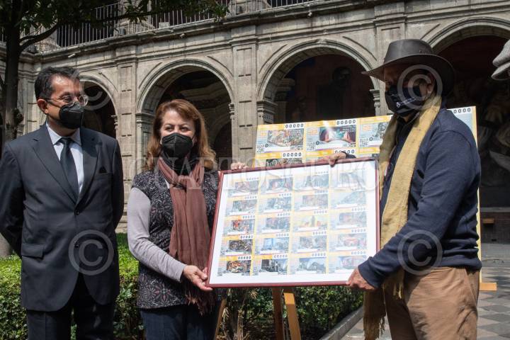 Emilio Revueltas Valle, nieto del muralista Fermín Revueltas; Margarita González Saravia Calderón, directora de la Lotería Nacional, Eduardo Vázquez Martín, coordinador Ejecutivo del Mandato del Antiguo Colegio de San Ildefonso, durante la presentación del billete alusivo de Lotería Nacional alusivos al Muralismo Mexicano y al Colegio de San Ildefonso.