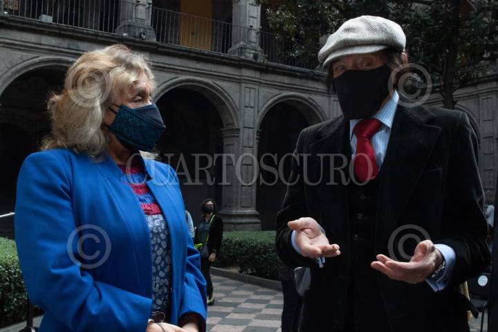 Lucina Jiménez López, directora general del INBAL, conversa con Jorge Ramón Alva Hernández, hijo del muralista Ramón Alva de la Canal, durante la presentación del billete alusivo de Lotería Nacional alusivos al Muralismo Mexicano y al Colegio de San Ildefonso.