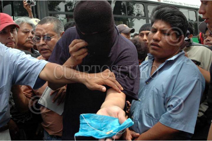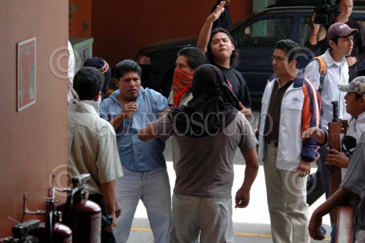 OAXACA, OAXACA31JULIO2006.- Detienen a policía auxiliar integrantes de la APPO , lo acusan de ser enviado de Ulises Ruiz y de tirar disparos al aire cuando se encontraban bloqueando las festividades de una calenda realizada por la secretaria de turismo en el parque del Paseo Juárez El Llano e irrumpen el Poder Judicial Federal para sacar al policía. FOTO:Blanca Esthela Hranández/CUARTOSCURO.COM