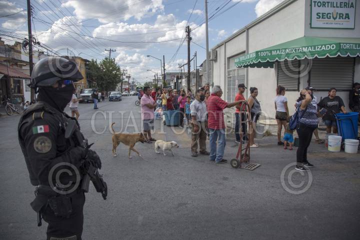 Decenas de personas bloquean calles del centro de Monterrey al no contar con agua en al menos una semana, a los manifestantes les proporcionaron agua de una pipa de empresa particular, la cual fue custodiada por elementos de policía Fuerza Civil.