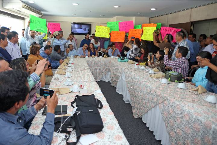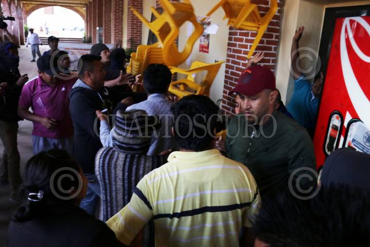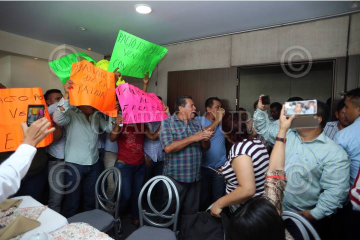 TUXTLA GUTÉRREZ, CHIAPAS, 21DICIEMBRE2017.- Manifestantes boicotearon una conferencia de prensa de la coalición PRD, PAN y MC en un hotel del municipio. FOTO: JACOB GARCÍA /CUARTOSCURO.COM