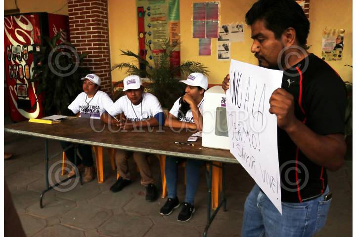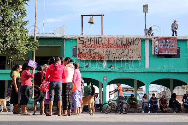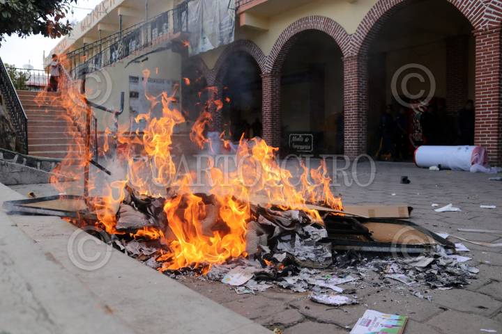 TEMOAC, MORELOS, 23FEBRERO2019.- Opositores al funcionamiento de la Central de Ciclo Combinado de la Comisión Federal de Electricidad (central termoeléctrica de Huexca, Yecapixtla) queman papeletas y mobiliario de la consulta que se realiza en este municipio. FOTO: MARGARITO PÉREZ RETANA /CUARTOSCURO.COM