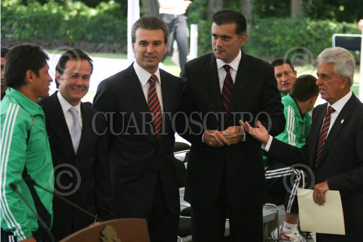 MÉXICO, D.F. 09OCTUBRE2009.- Javier González "China" entrenador de la selección Sub-17, Bernardo de la Garza Herrera, Director General de la Comisión de Cultura Fisica y Deporte, Néstor de la Torre Director de la Comisión de Selecciones Nacionales y Justino Compean Palacios Presidente de la Federación Mexicana de Fut bol, esto momentos antes de que el mandatario de México, abanderara a la Selección de Mexicana de futbol Sub-17, la cual participara en el próximo mundial en esta categoría que se realizara en Nigeria a partir del 24 de Octubre, esto en las instalaciones de la Residencia Oficial de los Pinos. FOTO: GUILLERMO PEREA / CUARTOSCURO.COM
