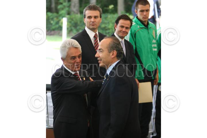 MÉXICO, D.F. 09OCTUBRE2009.- Felipe Calderón Hinojosa, Presidente de México, saluda a Justino Compean Palacios Presidente de la Federación Mexicana de Fut bol, momentos antes de abanderar a la Selección de Mexicana de futbol Sub-17, la cual participara en el próximo mundial en esta categoría que se realizara en Nigeria a partir del 24 de Octubre, esto en las instalaciones de la Residencia Oficial de los Pinos. FOTO: GUILLERMO PEREA / CUARTOSCURO.COM