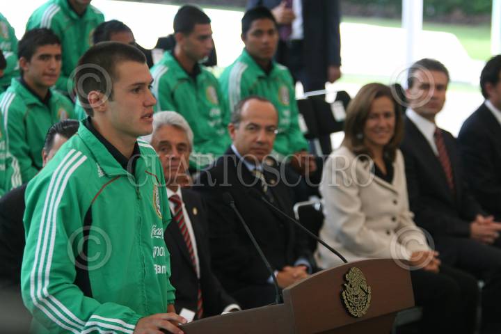 MÉXICO, D.F. 09OCTUBRE2009.- Kristian Alvarez Nuño, Capitan de la Selección Mexicana de Fut bol Sub-17 al momento de agradecer al mandatario el abanderamiento a la Selección de Mexicana de futbol Sub-17, la cual participara en el próximo mundial en esta categoría que se realizara en Nigeria a partir del 24 de Octubre, esto en las instalaciones de la Residencia Oficial de los Pinos. FOTO: GUILLERMO PEREA / CUARTOSCURO.COM