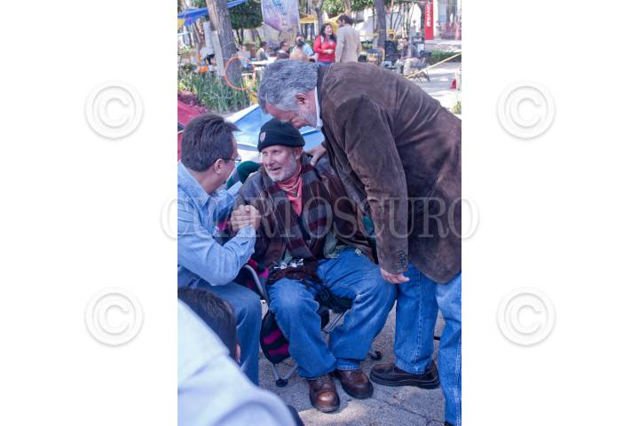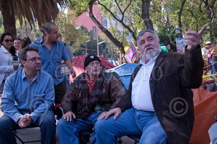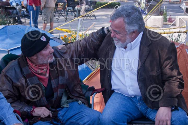 MÉXICO, D.F., 05NOVIEMBRE2011.- El diputado federal Alejandro Encinas visitó el campamento de los "Indignados" frente a la Bolsa Mexicana de Valores, donde se entrevistó con el profesor de la Universidad Autónoma Metropolitana, Edur Velasco, quien se mantiene en huelga de hambre en busca de un mejor presupuesto para la educación. FOTO: ISAAC ESQUIVEL/CUARTOSCURO.COM
