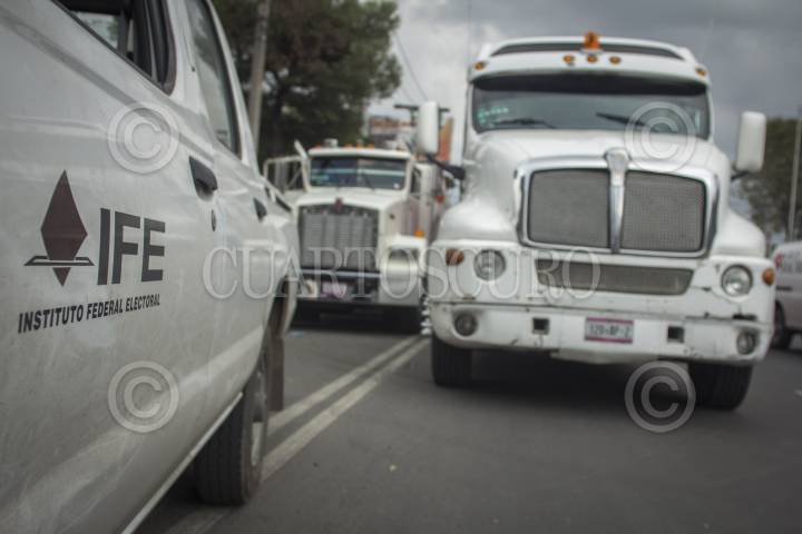 MÉXICO, D.F., 10SEPTIEMBRE2013.- Tras la llegada del primer convoy de boletas electorales a la empresa Bio Papel en la avenida Poniente 140 en la colonia Vallejo alrededor de las 14:30 horas, autoridades del Instituto Federal Electoral pasaron mas de 4 horas realizando una serie de tramites mismos que versiones extraoficiales mencionaron que al no llegar a un acuerdo con la empresa misma que anunciaron del dia de ayer seria la encargada de triturar los mas de 150 toneladas de material electoral de 2005-2006, los tres camiones que contenían este primer viaje, regresaran a la bodega Nacional del IFE ubicada en Tepotzotlan a la espera de encontrar otra empresa que realice la labor de destrucción del material electoral. FOTO: ENRIQUE ORDÓÑEZ /CUARTOSCURO.COM