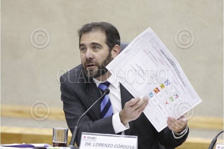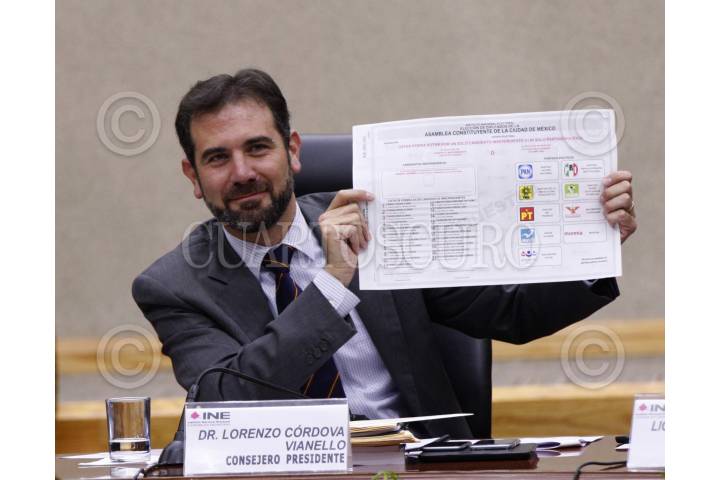 CIUDAD DE MÉXICO, 17FEBRERO2016.- Lorenzo Córdova, consejero presidente del Instituto Nacional Electoral, muestra la boleta para elegir a los diputados de la Asamblea Constituyente de la Ciudad de México en la sesión. FOTO: CUARTOSCURO.COM