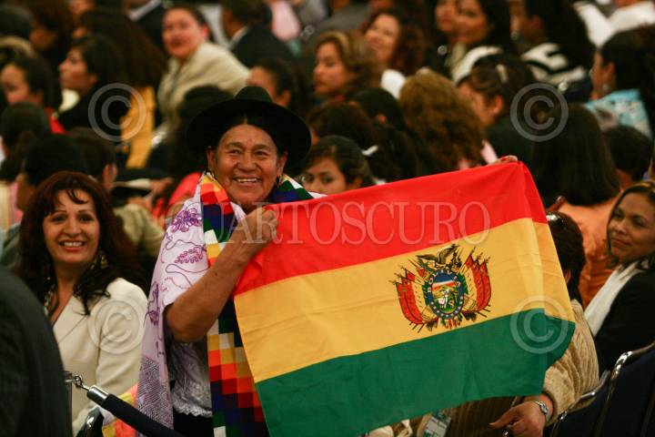 MÉXICO D.F., 12AGOSTO2008.-Una mujer boliviana saca su bandera previo al 3.er encuentro internacional de empresarias sociales del fondo nacional de apoyos a empresas en solidaridad 2008, realizado en el salon valparaiso del centro Banamex FOTO: SÁSHENKA GUTIÉRREZ /CUARTOSCURO.COM