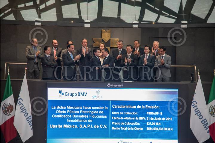 CIUDAD DE MÉXICO, 26JUNIO2018.- José Oriol Bosch, director general del Grupo Bosla Mexicana de Valores; Rodolfo Balmaceda, director general de Fibra Upsite; Javeir Artigas, director general de BTG Pactual México y Luis Armando Álvarez, director general de Banco Actinver, encabezaron la ceremonia del listado del Oferta Pública Restringida de Certificados Bursátiles Fiduciarios Inmobiliarios de Upsite México, con clave de cotización FIBRAUP, en la Bolsa Mexicana de Valores. FOTO: MARIO JASSO /CUARTOSCURO.COM