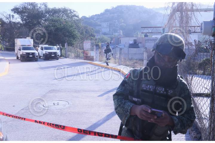 Un soldado del Ejército resguarda una escena de crimen donde fueron localizados dos cadáveres de hombres en el municipio de Temixco.