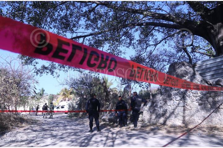 Perímetro de una escena de un crimen acordonado por policías de Morelos; esta mañana se reportó el hallazgo de dos cadáveres envueltos en bolsas de basura en una colonia de Temixco.