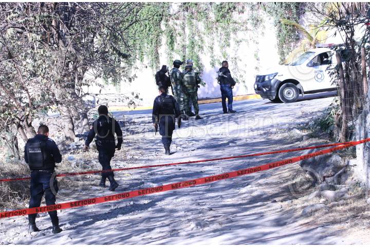 Policías, elementos del Ejército y de la Guardia Nacional en una escena de crimen donde localizaron dos cadáveres de hombres en Temixco, Morelos.