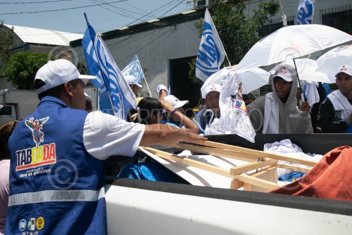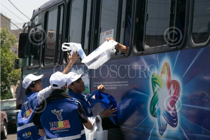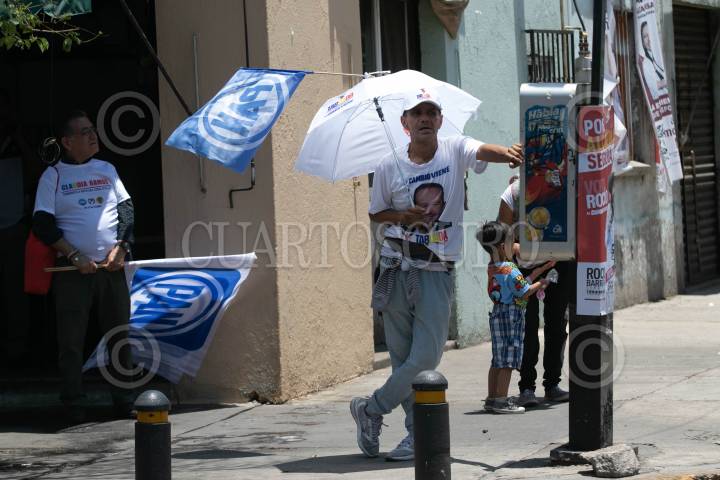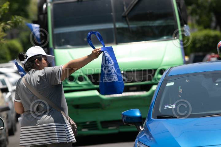 CIUDAD DE MÉXICO, 27MAYO2024.- Simpatizantes de la alianza Fuerza y Corazón por México en la capital reparten bolsas, banderas, camisetas y sombrillas con la imagen o slogan de sus candidatos. FOTO: MOISÉS PABLO/CUARTOSCURO.COM