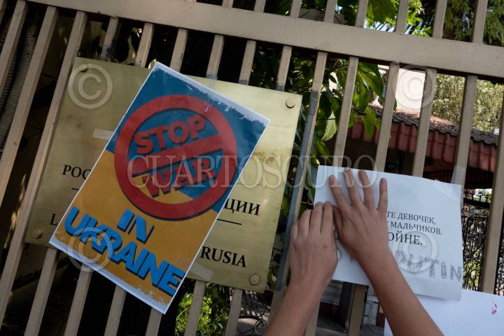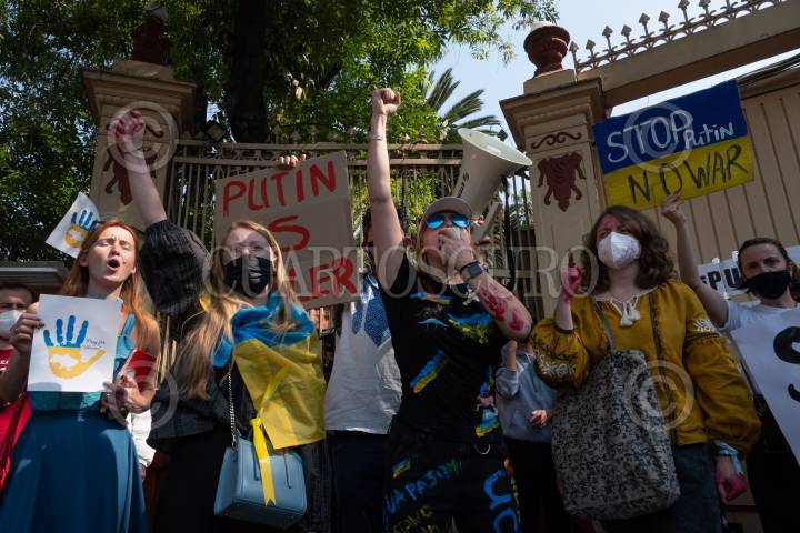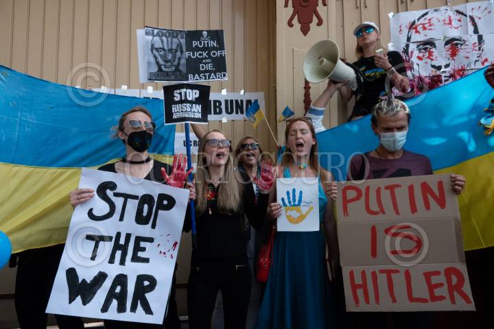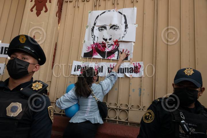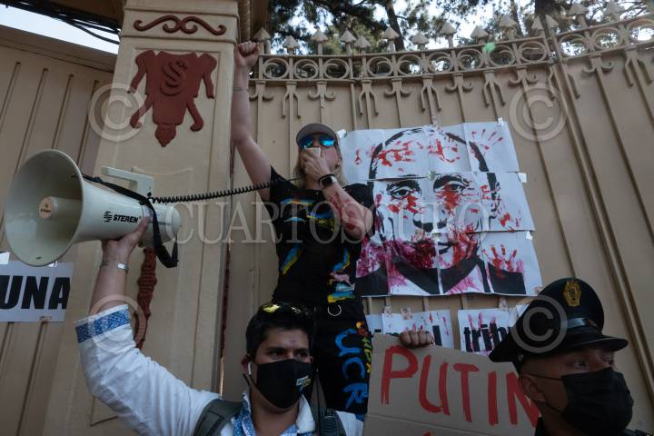 Integrantes de la comunidad ucraniana protestaron afuera de la Embajada de Ucrania para exigir justicia por la "operación militar especial" que el presidente de Rusia, Vladimir Putin, declaró esta madrugada