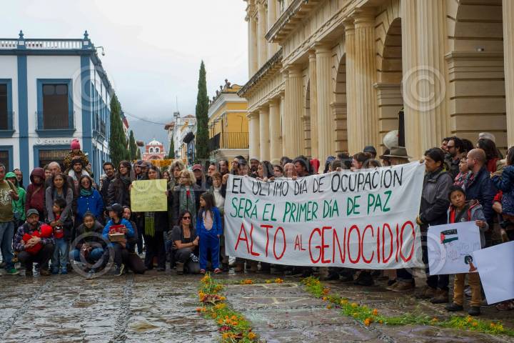 SAN CRISTÓBAL DE LAS CASAS, CHIAPAS, 04NOVIEMBRE2023.- Decenas de personas de la sociedad civil organizada realizaron una acción pacífica en las inmediaciones del Museo de San Cristóbal en solidaridad al pueblo de Palestina y exigir cese al bombardeo del ejército israelí al territorio de Gaza. FOTO: ISABEL MATEOS/CUARTOSCURO.COM